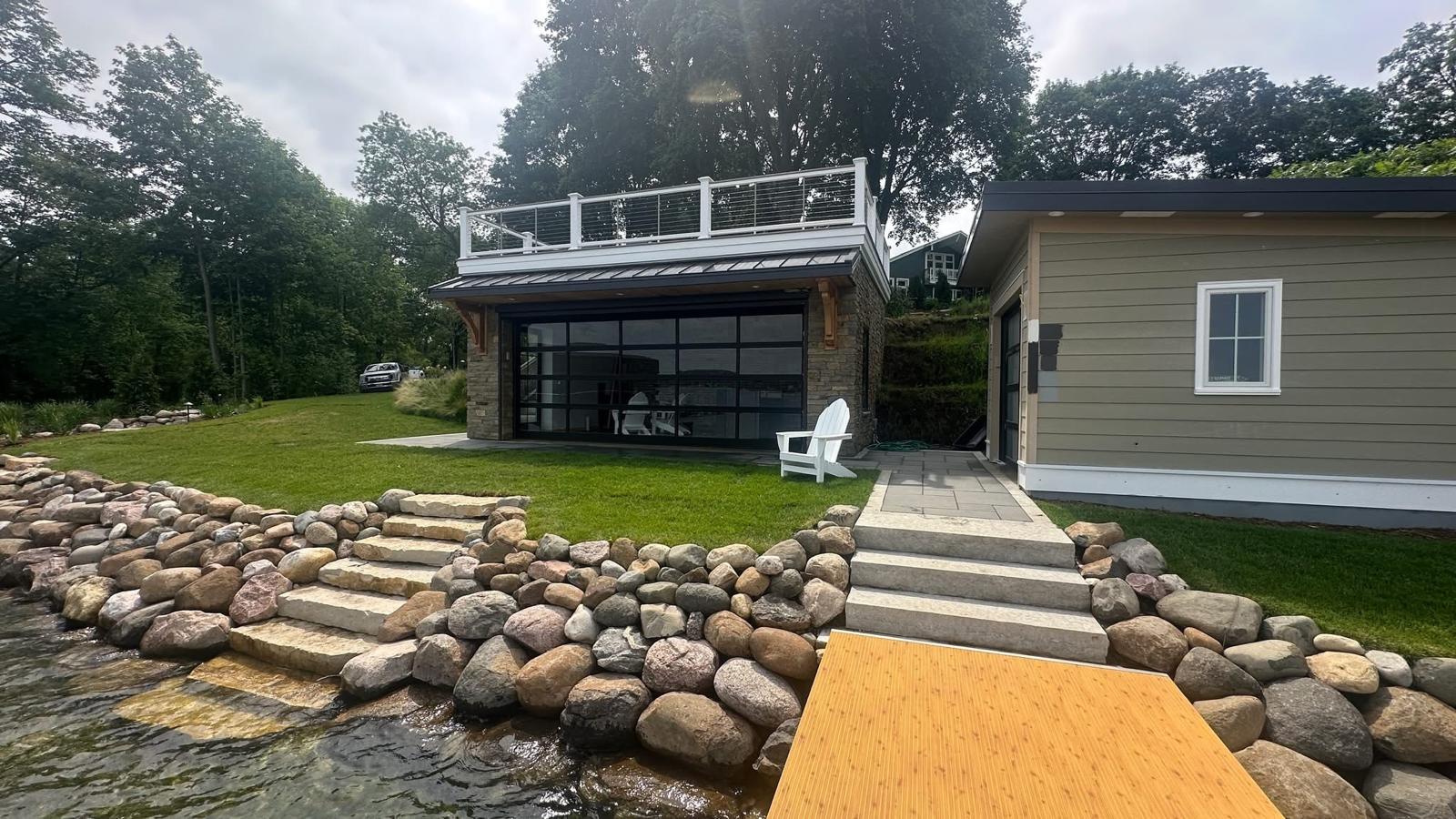 A boathouse should look like it belongs — tied into the house style, the retaining walls, and the shoreline plantings around it. Siding, stone accents, roof pitch, and trim details all connect it visually to the rest of the property so it feels intentional, not dropped in.